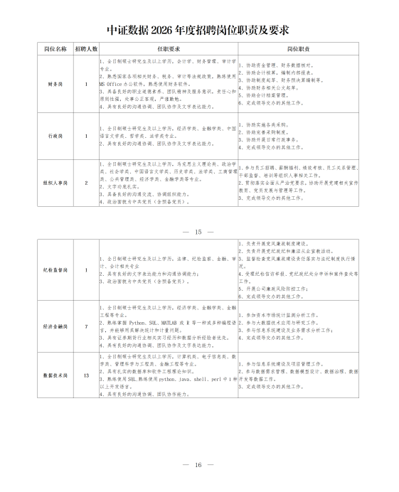 中证数据2026年度招聘岗位职责及要求